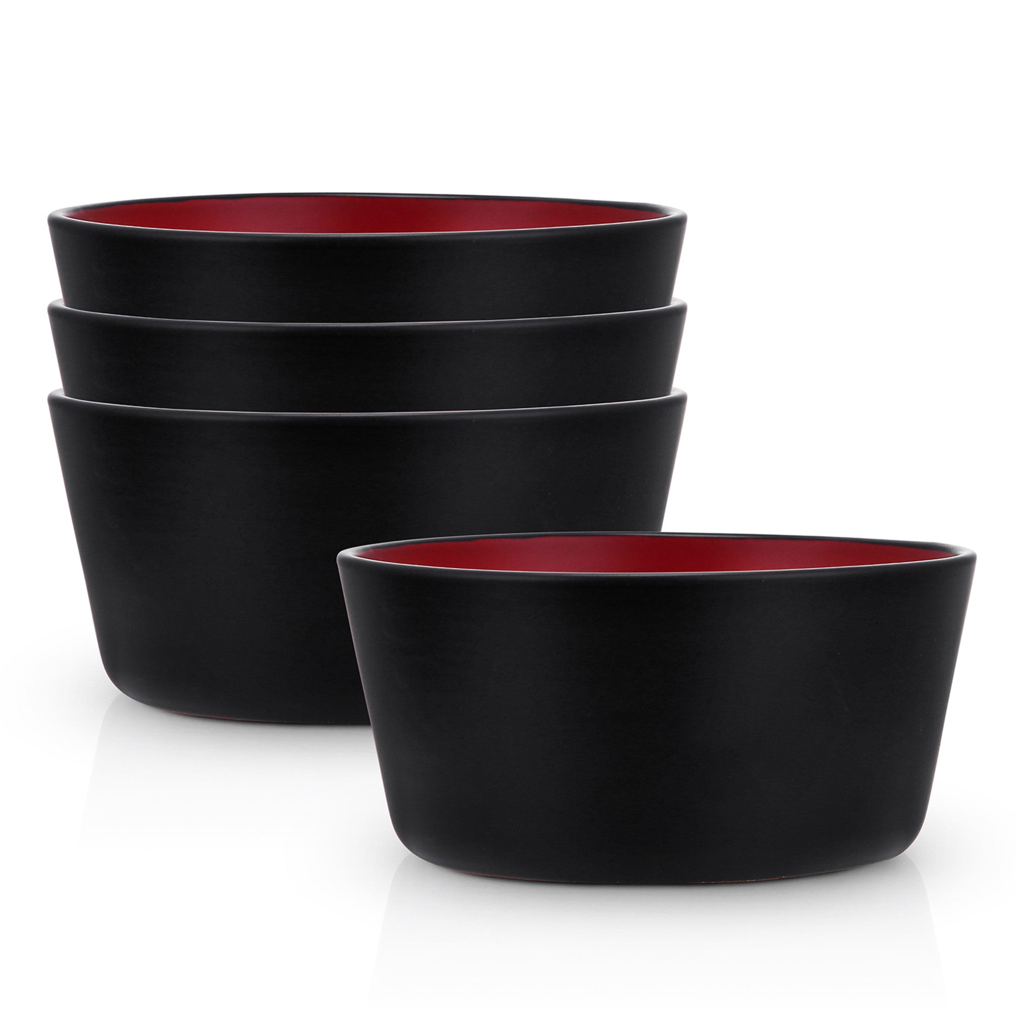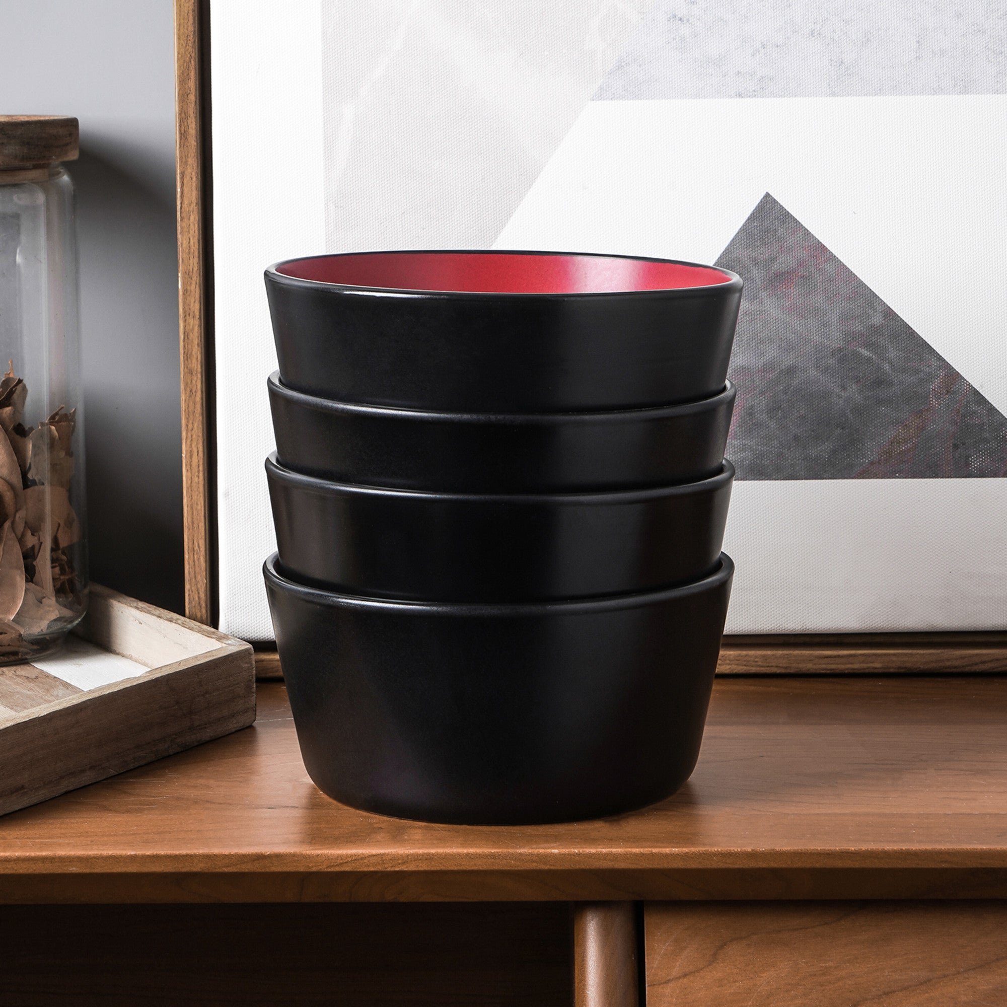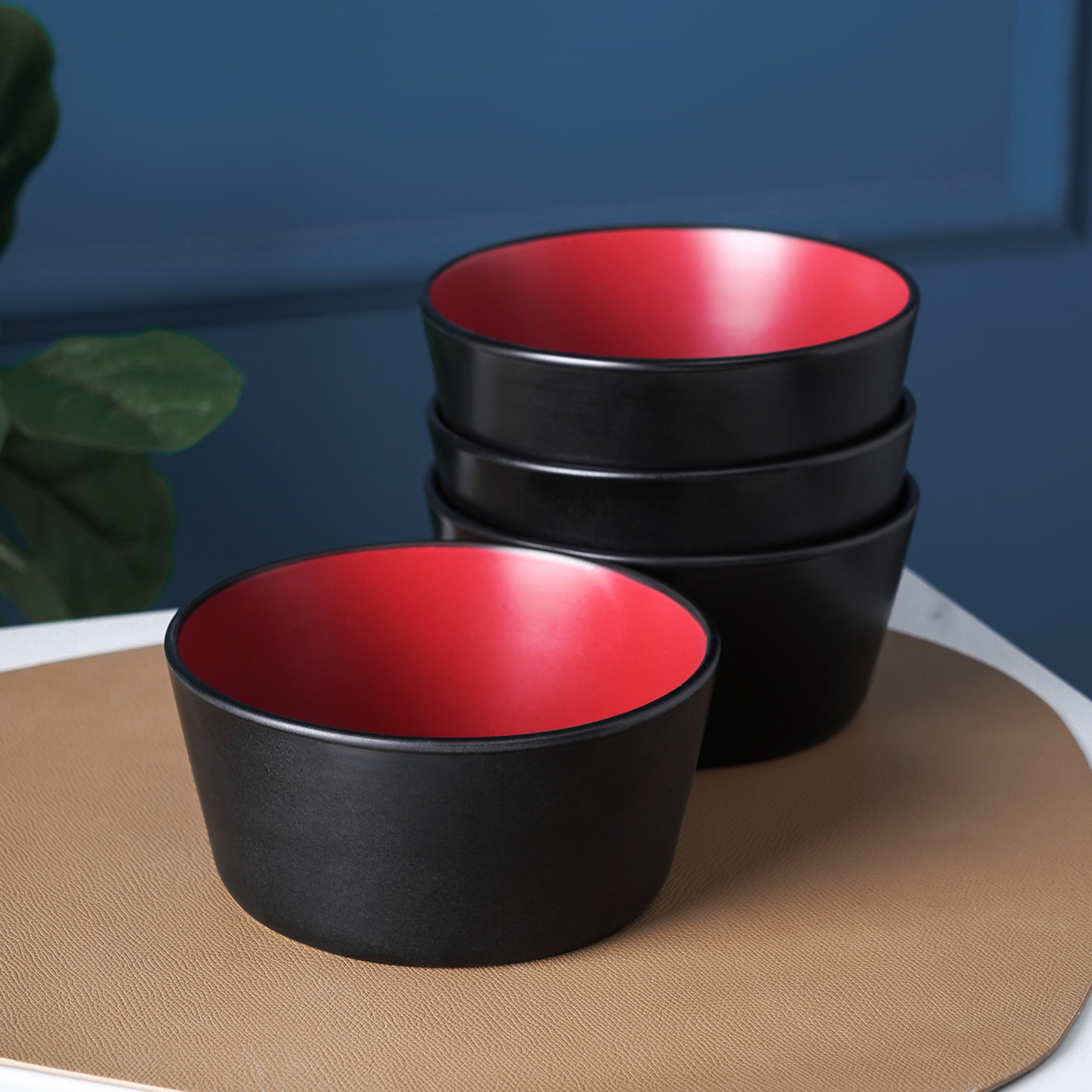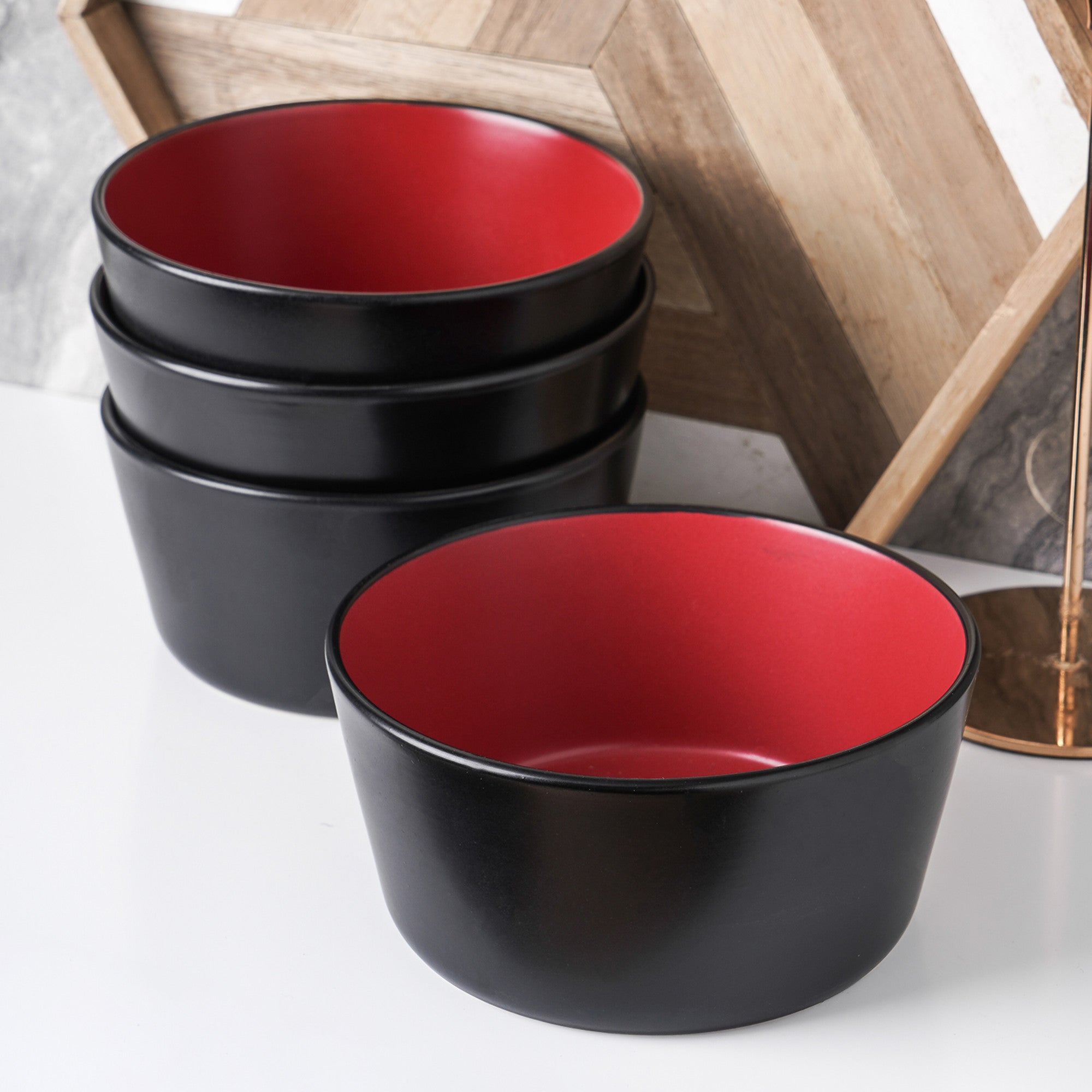 Enhance your dining experience with this modern bowl set. The set features high – quality ceramic bowls with a striking contrast of matte black exteriors and glossy red interiors. Their round, shallow shape and thin, smooth black rims add a touch of contemporary elegance to any table.