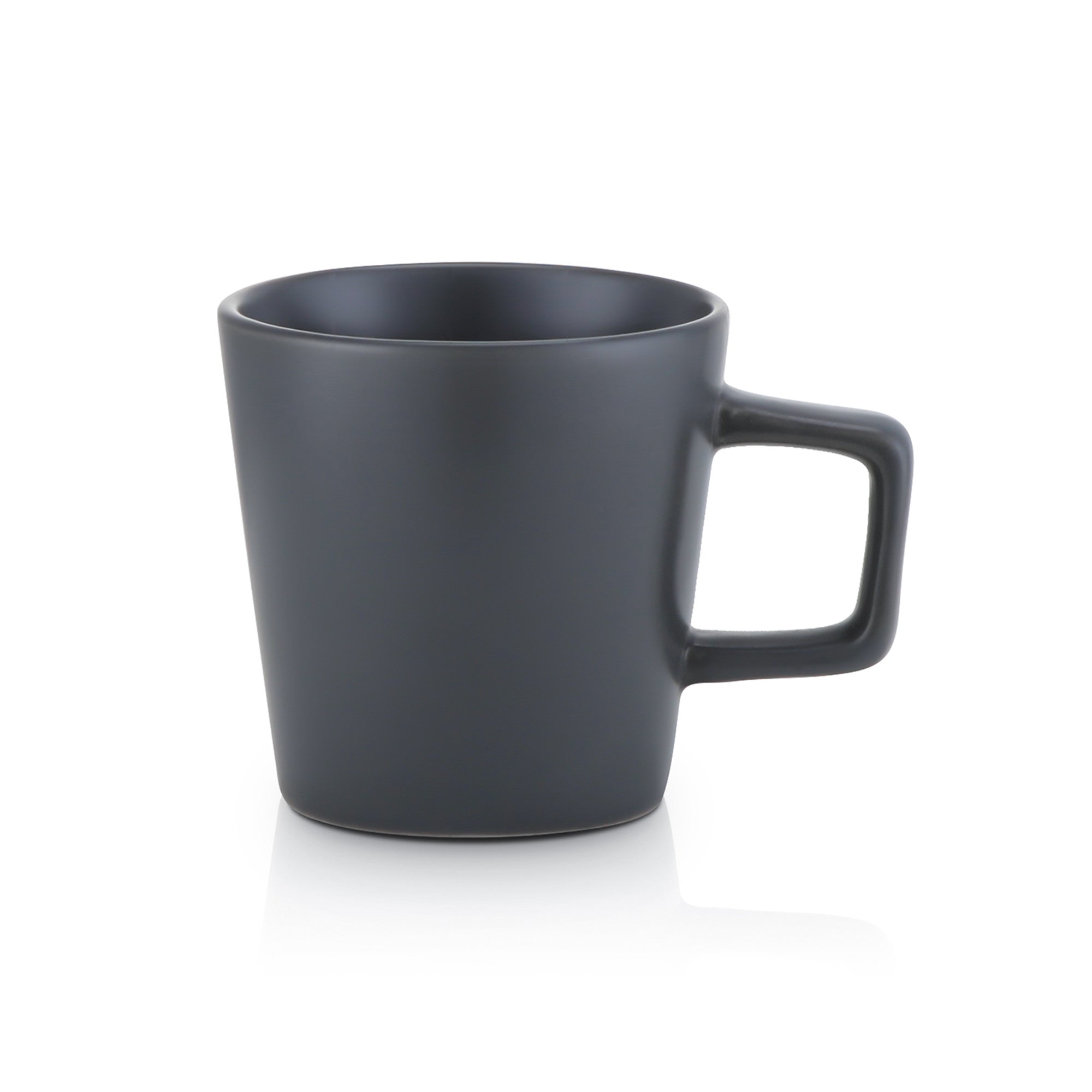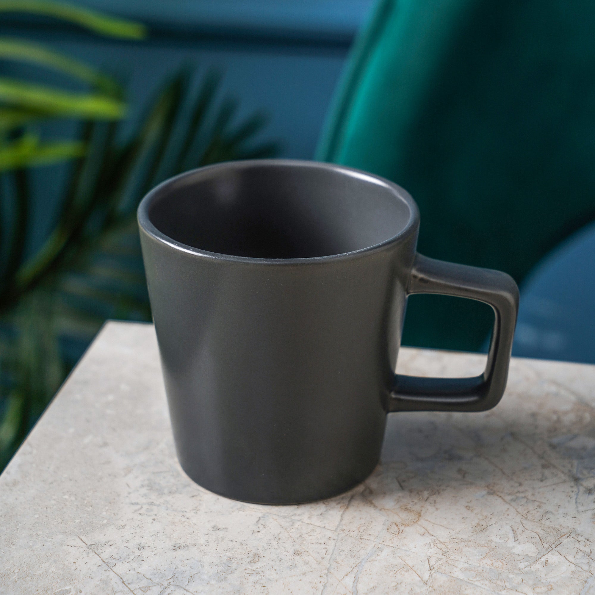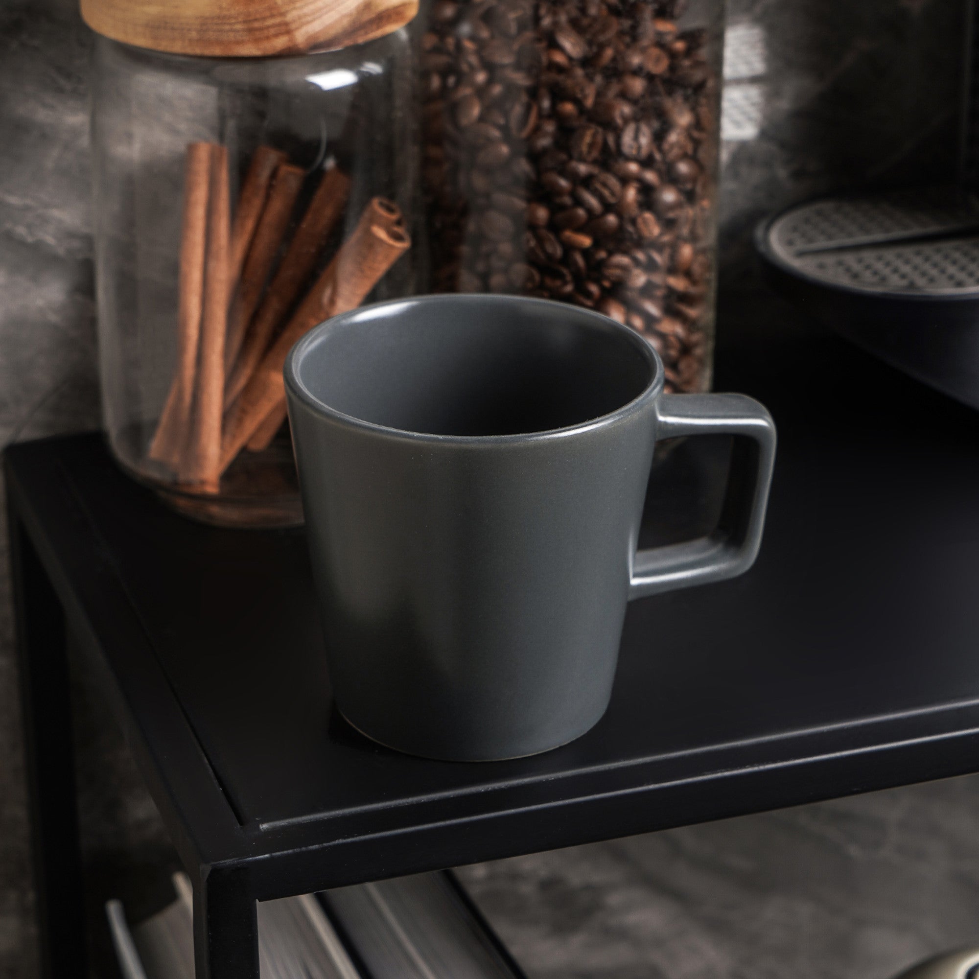 Introducing a single, modern ceramic mug in a striking dark gray matte finish. With its straight vertical walls, smooth rounded rim, and minimalist angular handle, this mug exudes a contemporary and understated charm, perfect for any modern interior.