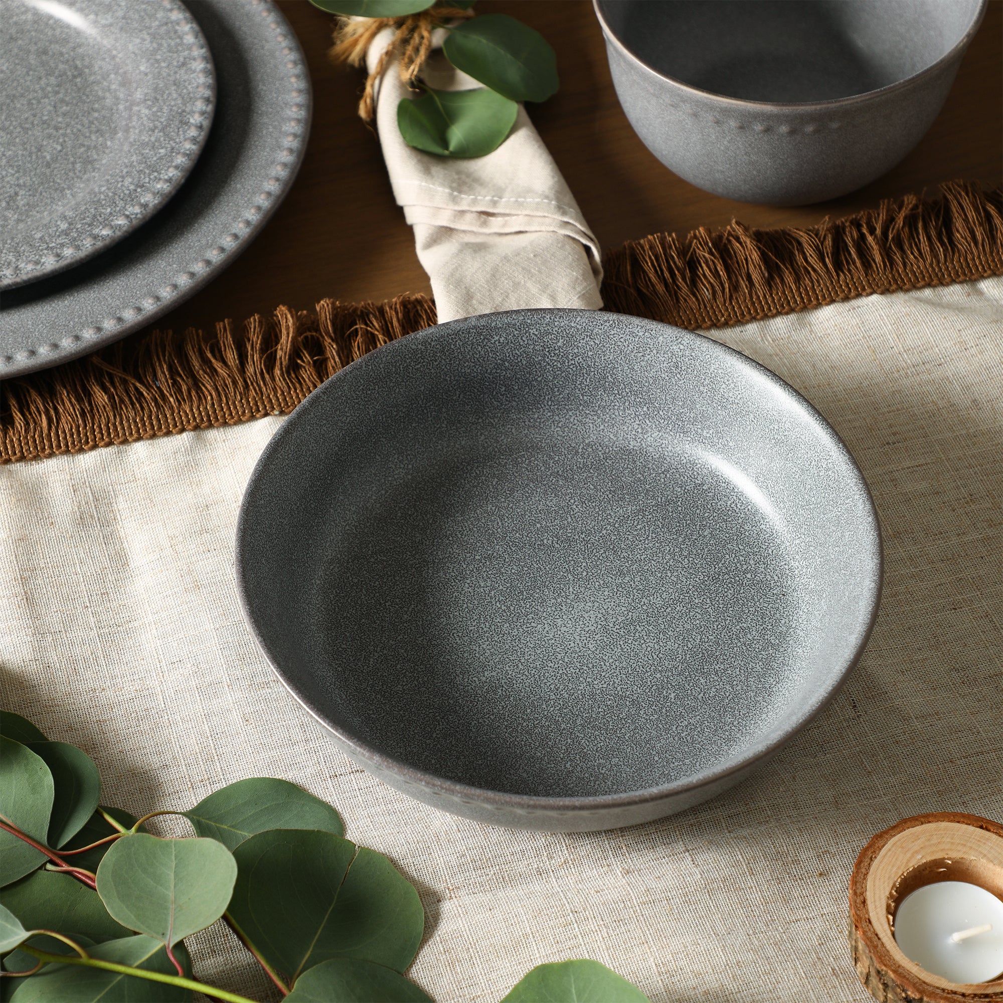 Introducing a stunning dinnerware set that combines modern and rustic elements. This set features a monochromatic charcoal gray color scheme, with a large coupe-style dinner plate boasting an embossed beaded rim and a smaller shallow bowl with a smooth rim. Made from high-quality stoneware, it offers both style and durability.