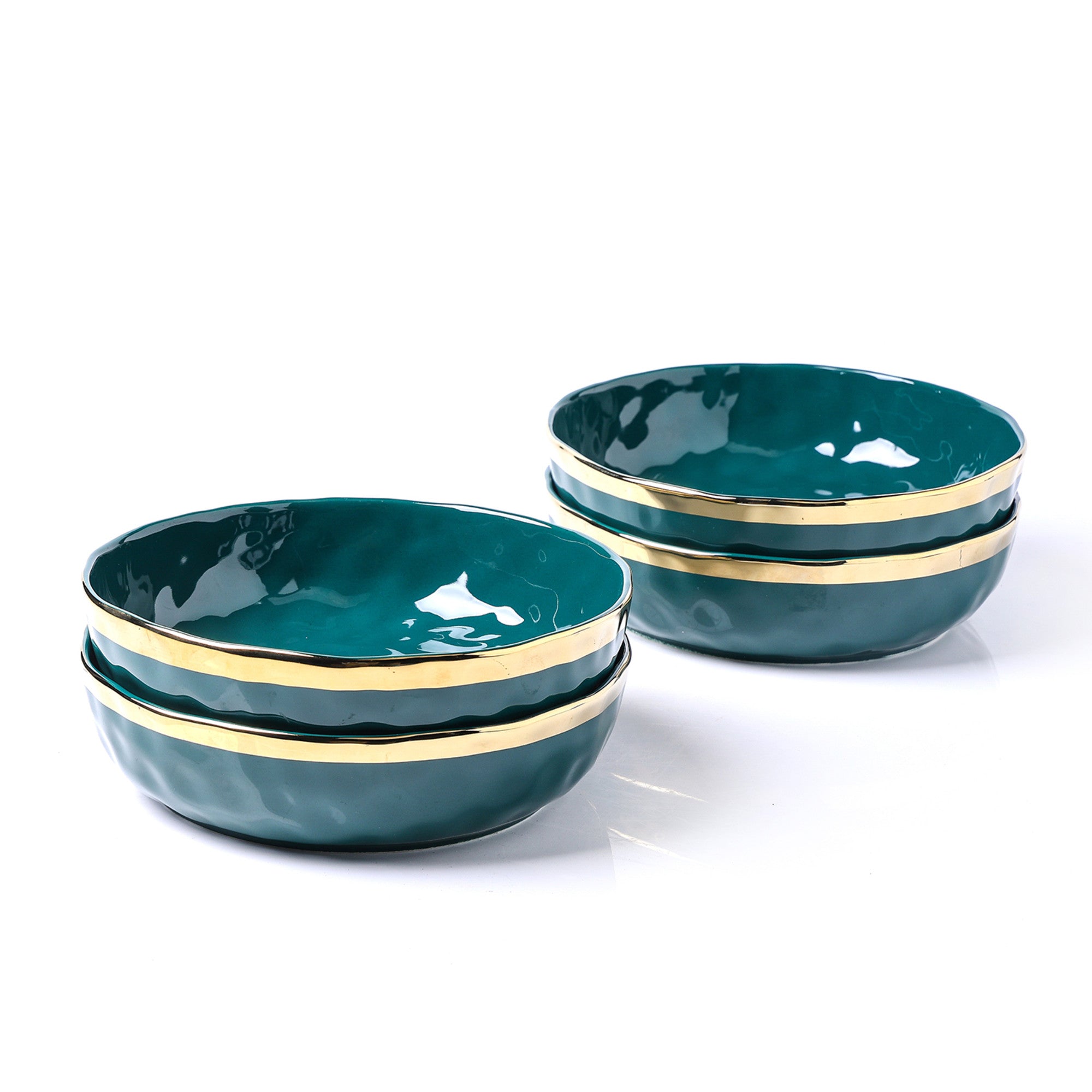 Enhance your dining experience with this exquisite bowl set. Crafted from high – quality ceramic, the set features teal bowls with a luxurious gold rim. The deep, rounded shape and wide, flared rim make them perfect for serving pasta, soup, or salads.