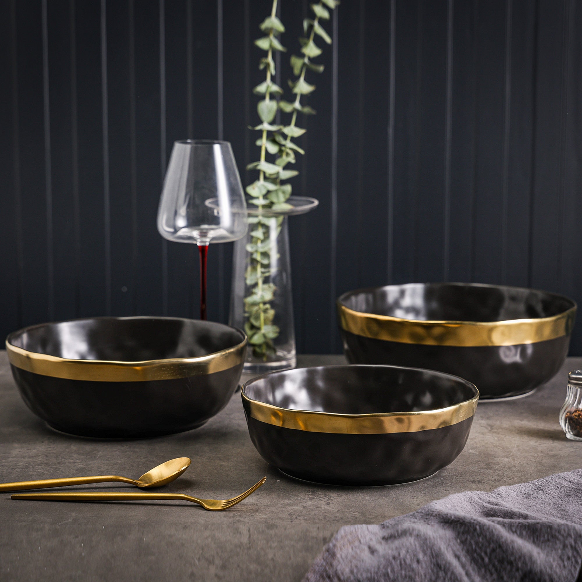 - Design: Solid matte – black body with a single thick metallic gold rimmed band. The bowls have an irregular/hammered exterior texture and a slightly wavy top edge.