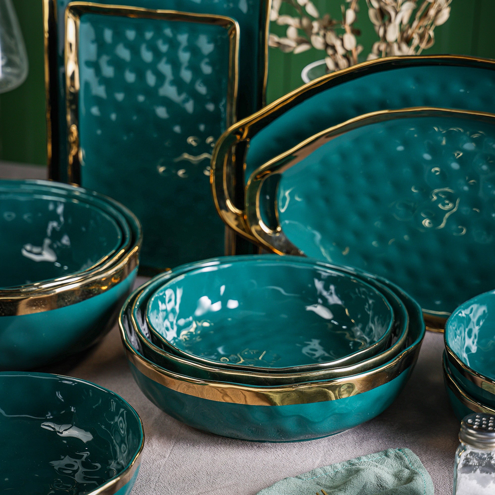 - Design: Solid teal body with a thick, bright gold band along the inner and outer rim. The exterior has a subtle, organic texture, and the bowls have an irregular, organic silhouette with gently undulating edges.