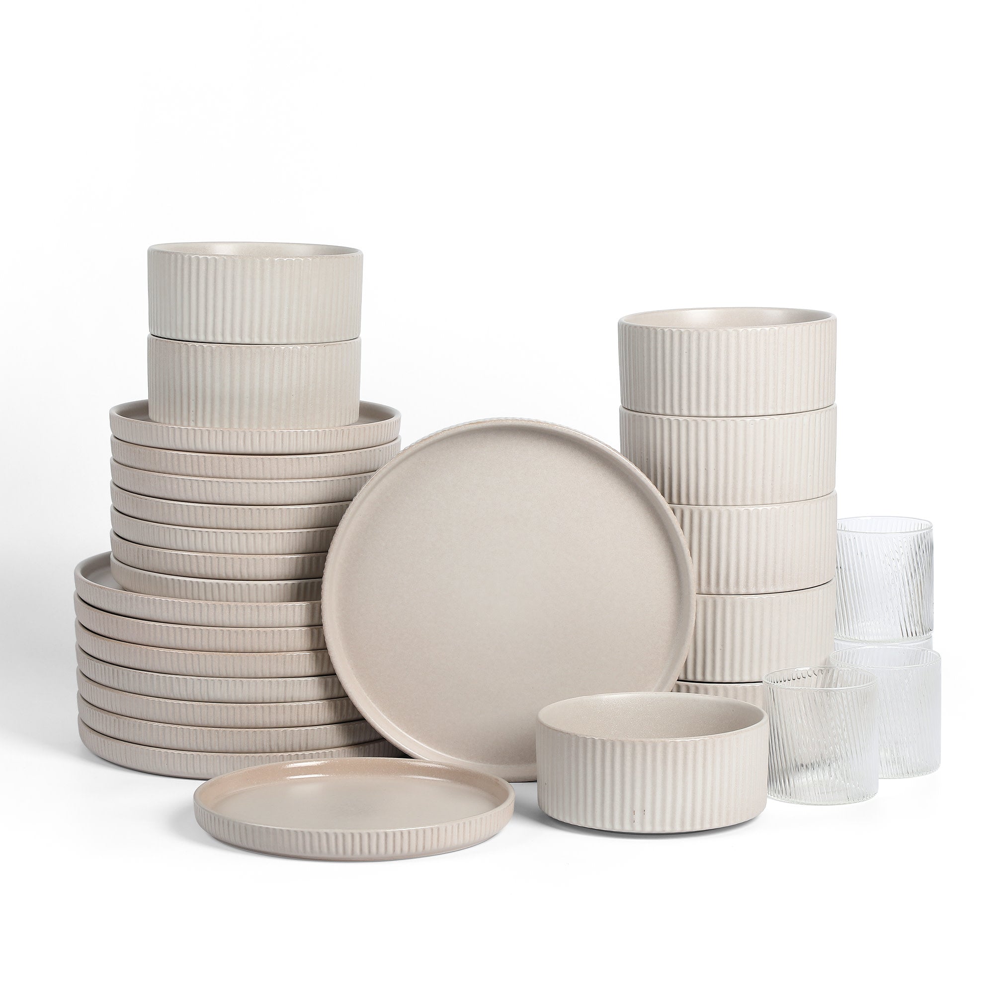 Enhance your dining experience with this modern dinnerware set. Crafted from stoneware, it features a monochromatic light neutral color scheme, specifically a taupe/ash gray/beige tone. The set includes bowls with a vertical fluted texture on the exterior and plates with fluted rim detailing, offering a refined and textural aesthetic.