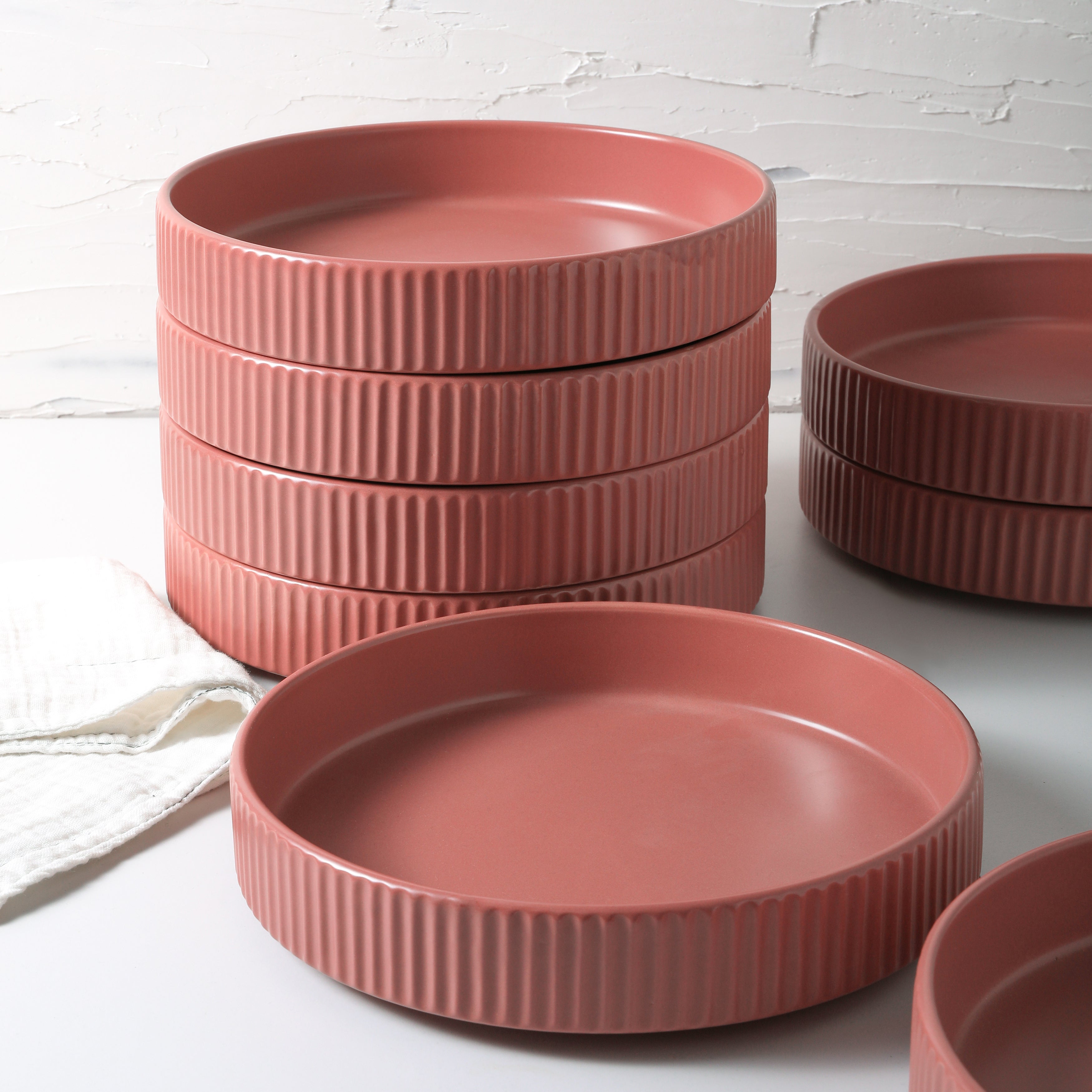 Enhance your dining experience with this modern and minimalist dinnerware set. Crafted from ceramic with a matte finish, it showcases a beautiful dusty rose/terracotta color. The set features plates and bowls with embossed ridged textures, adding a touch of sophistication to your table.
