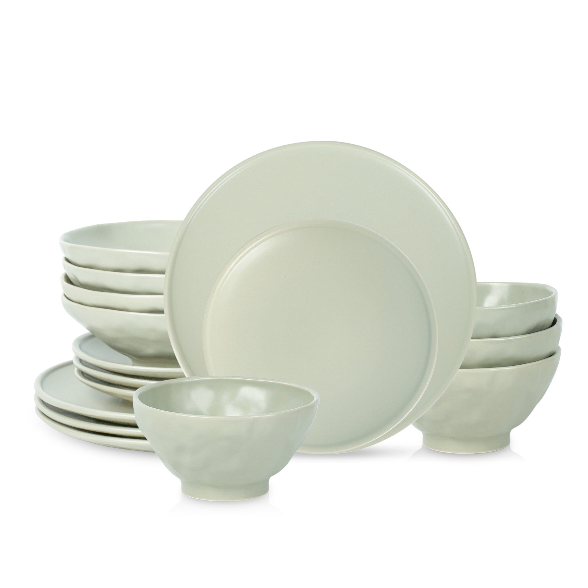 - Design: Solid sage green color. Plates are smooth with a rimmed, wide edge, while bowls have a dimpled/pebbled finish for grip. All pieces have classic round forms.