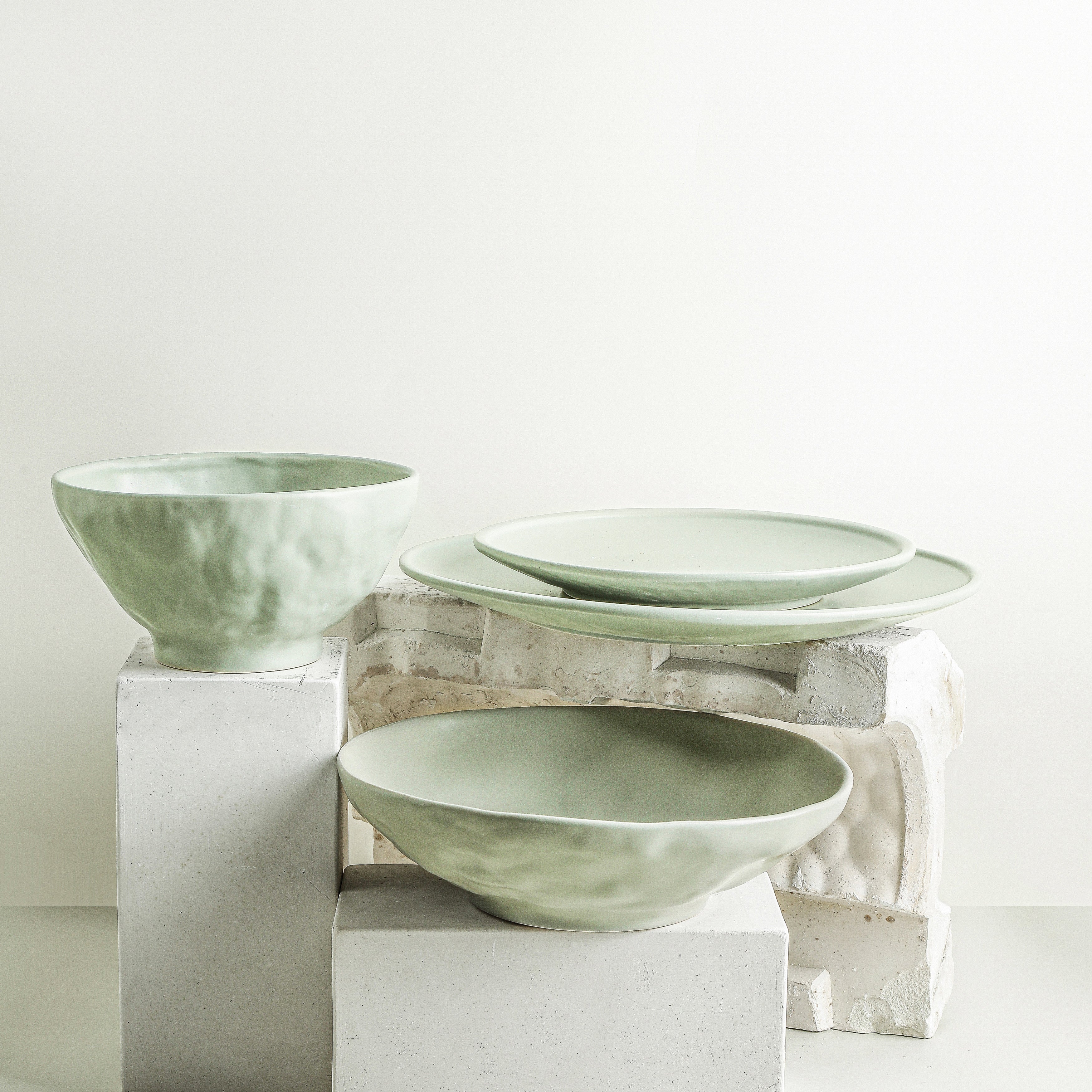 Discover this exquisite dinnerware set crafted from high – quality ceramic. Boasting a solid, muted sage green color, it offers a cohesive and calming palette. The set includes multiple sizes of plates and two types of bowls, with smooth plates and subtly textured bowls for a unique touch.