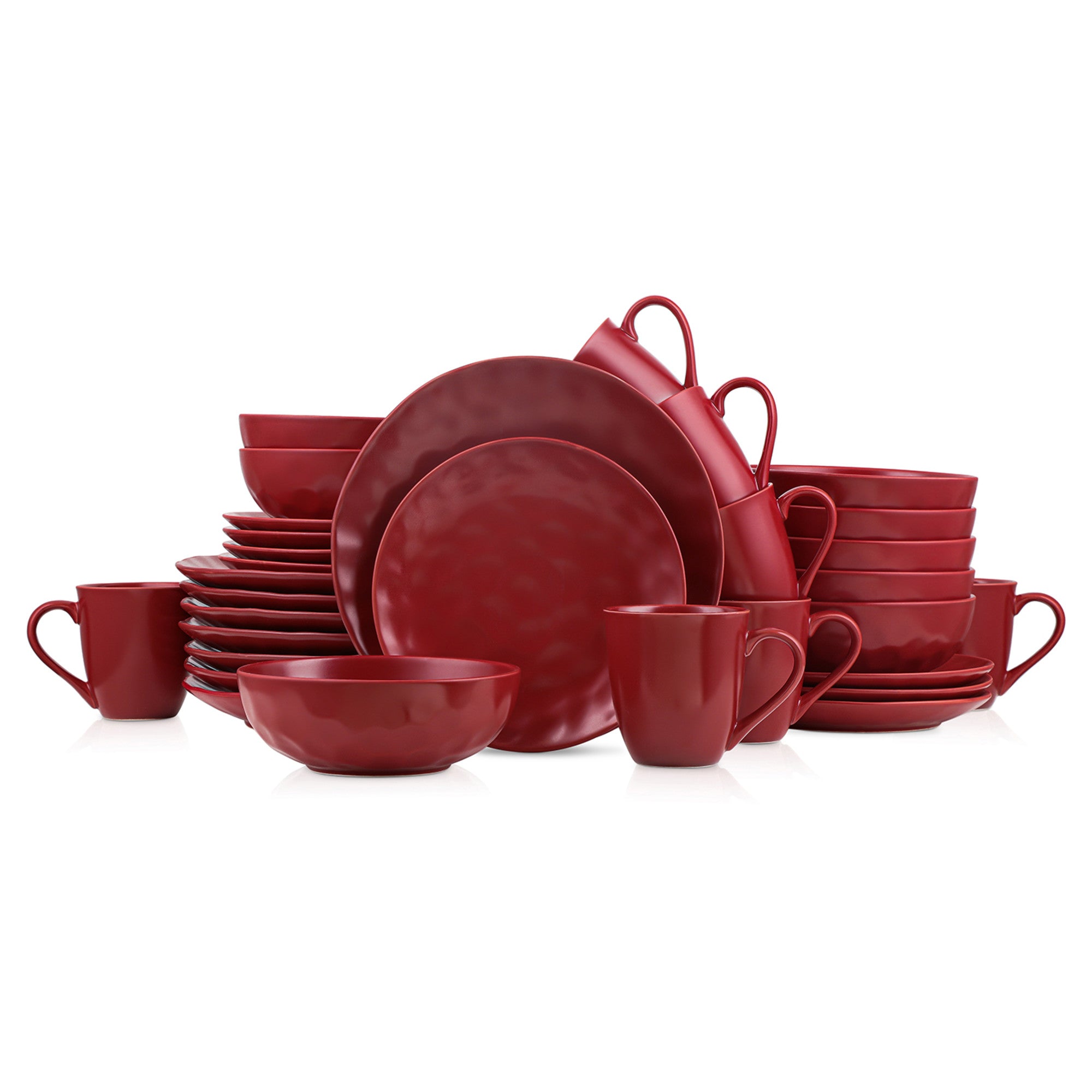 - Design: Solid deep matte red color, textured faceted geometric pattern on the exterior, shallow wide bowls with a rimmed edge and curved interior.