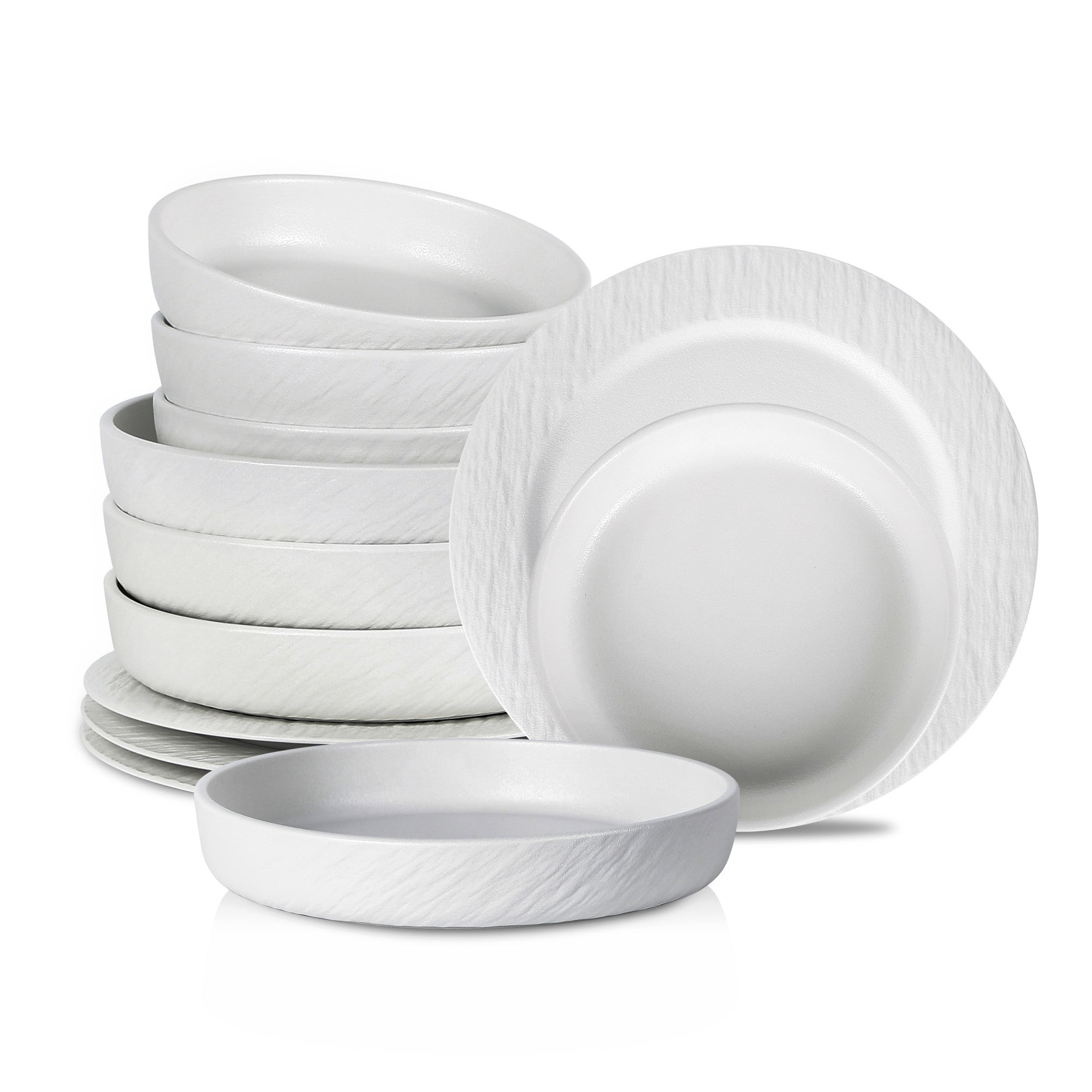 - Design: Solid white color, subtle embossed linear or rippled texture on the exterior, rimmed and shallow coupe – style plates and bowls with straight, minimalist rims