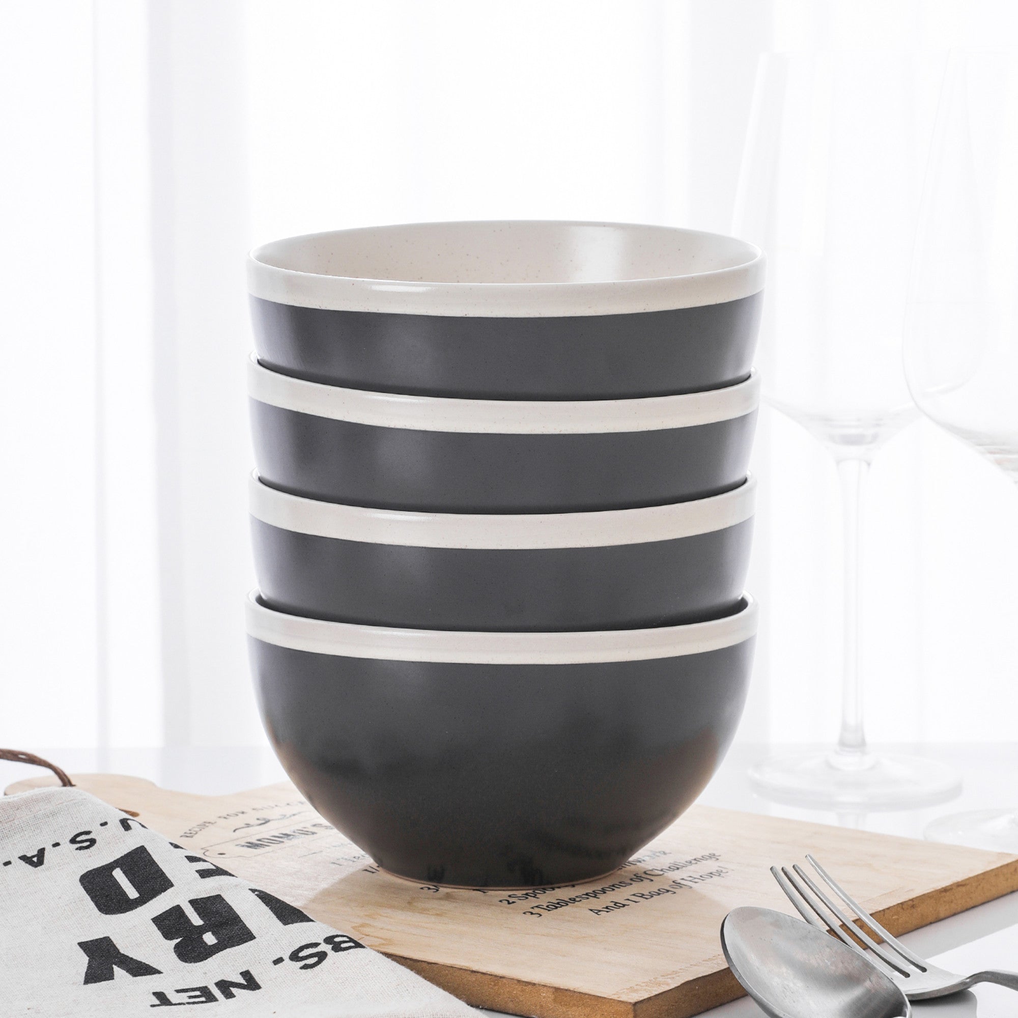Enhance your dining experience with this stylish 4-piece stoneware bowl set. The set features a contemporary design with a two-tone color scheme, combining a gray body with a white rim and interior. The bowls have a rounded shape, a wide base, and a subtle speckled texture on the gray exterior, adding a touch of modern sophistication.