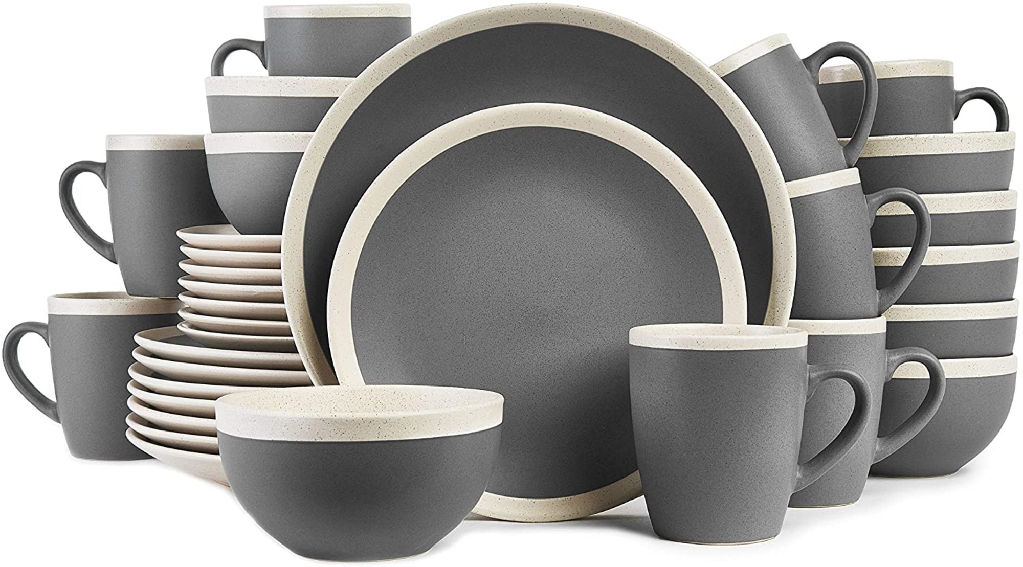 Enhance your dining experience with this modern plate set. Crafted from high-quality stoneware, the set features plates in two sizes, with a striking contrast of solid matte charcoal – gray interiors and light speckled beige rims. The clean, round design with wide, flat rims exudes a minimalist charm.