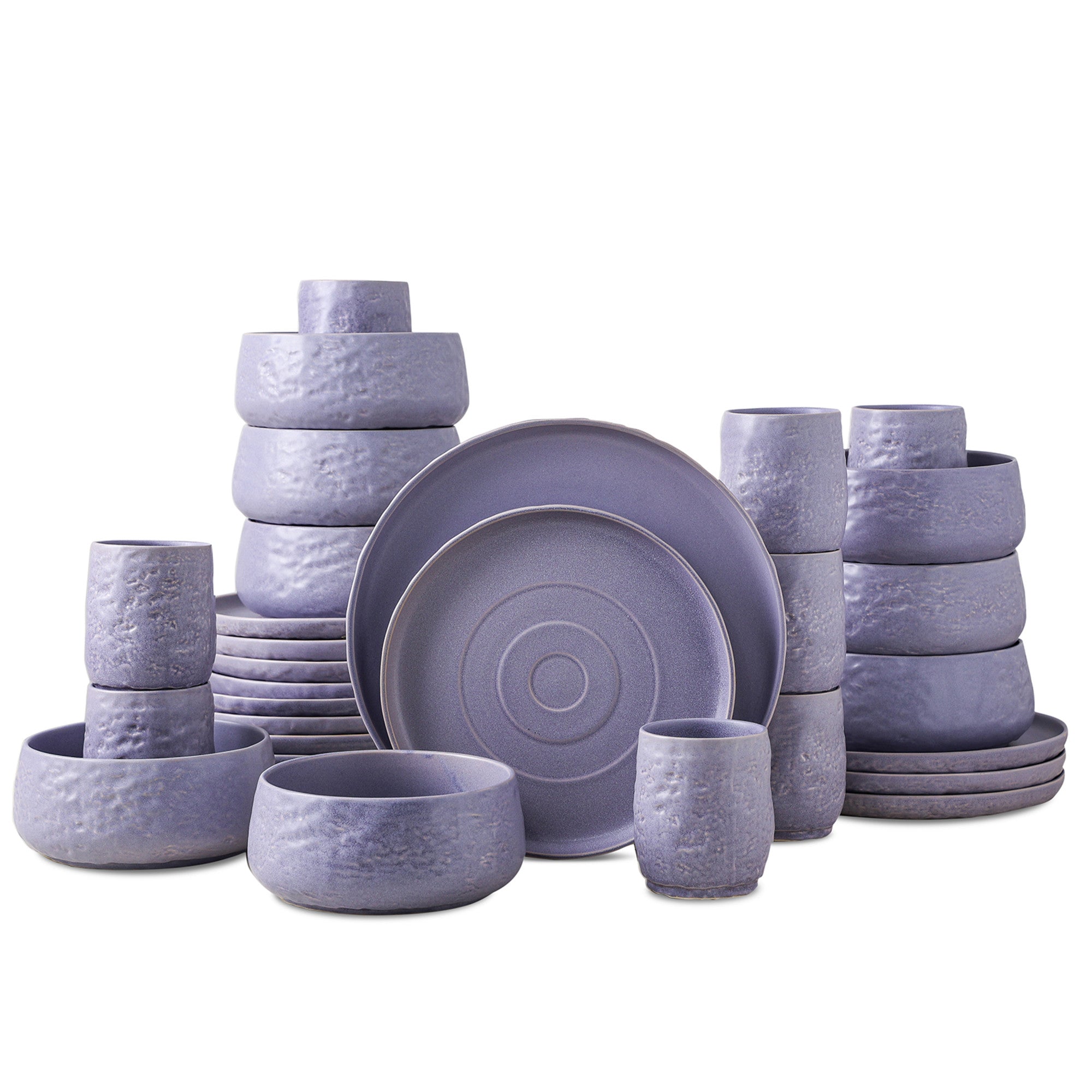 - Design: Monochromatic soft lavender color, concentric ring detailing on plates, hammered texture on mugs and lidded pot, and decorative text on the underside of some pieces.