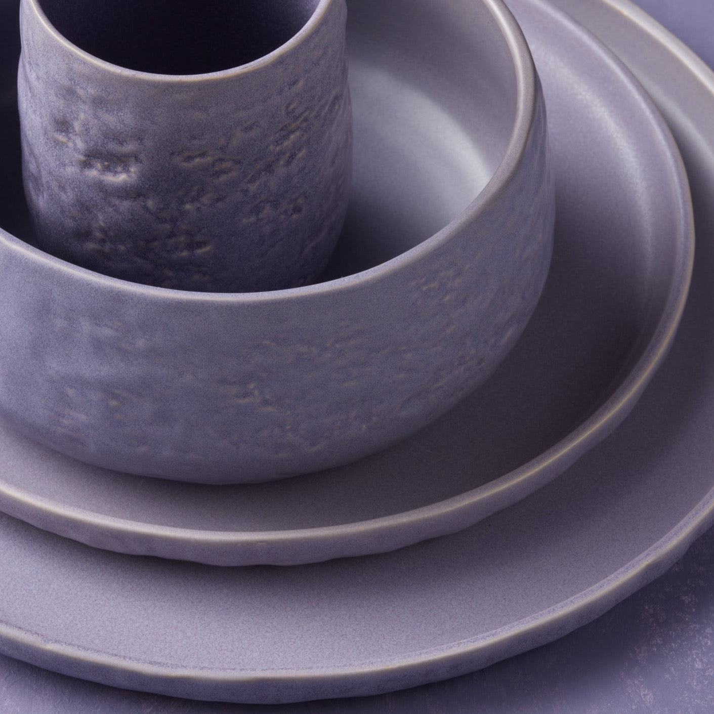 Enhance your dining experience with this stunning dinnerware set. Crafted from high – quality stoneware, it features a soft lavender monochromatic color with a smooth matte finish. The set includes plates with concentric ring detailing, textured mugs, and a lidded serving pot with decorative text on the underside, offering a modern and minimalist aesthetic.
