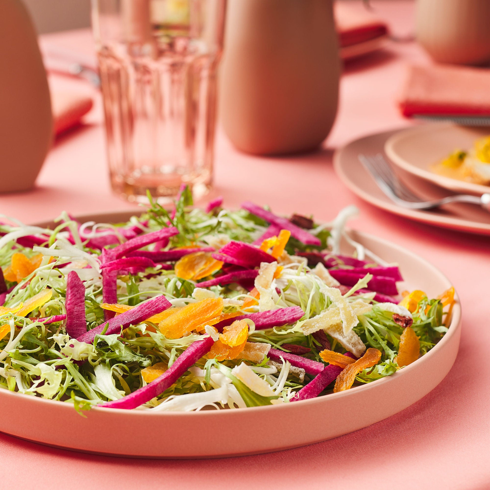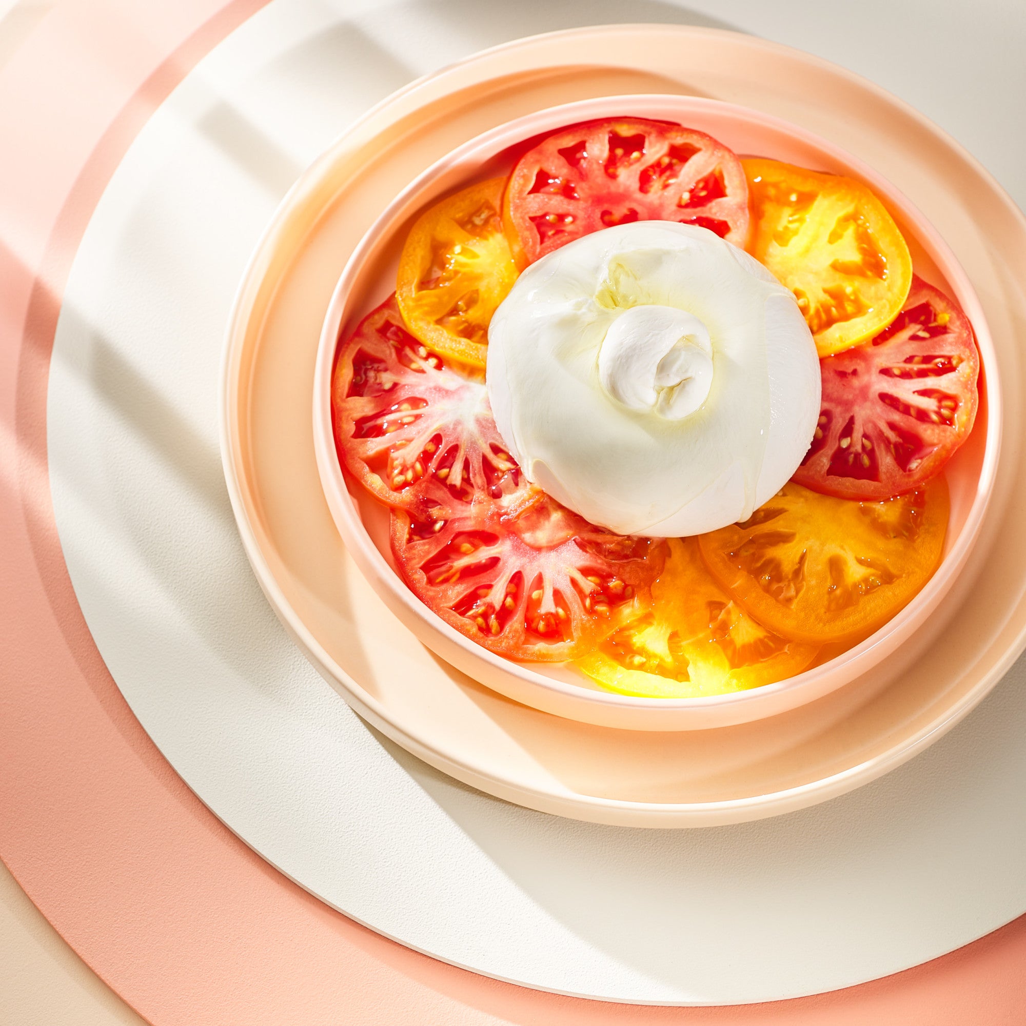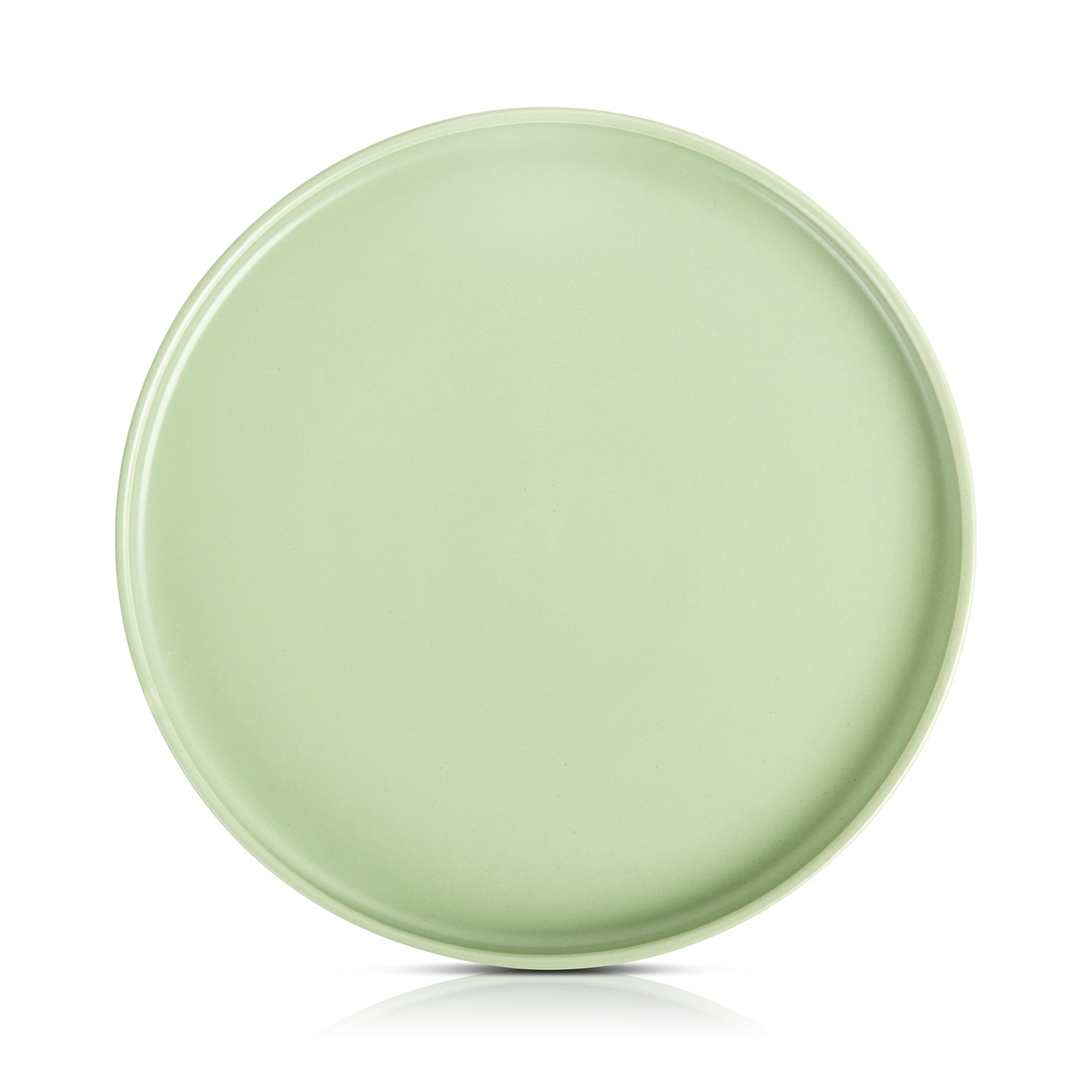 - Design: A solid, uniform blush/peach color with no patterns. It has a classic round rimmed shape with a smooth, clean edge and a slight indentation on the rim.