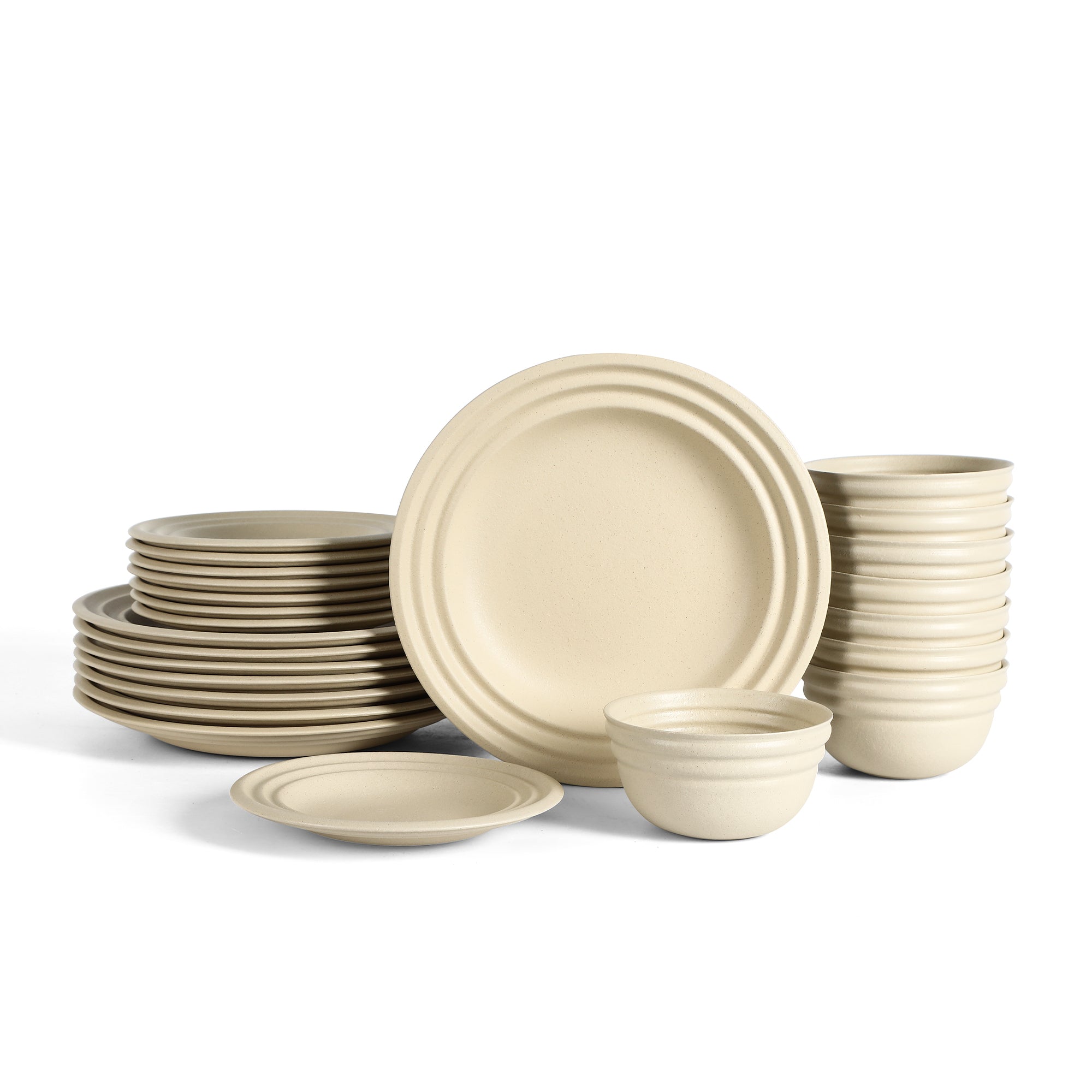- Design: Solid cream/ivory color, bowls with embossed ridging for added tactile interest, and plates with a simple, straight – rimmed design.