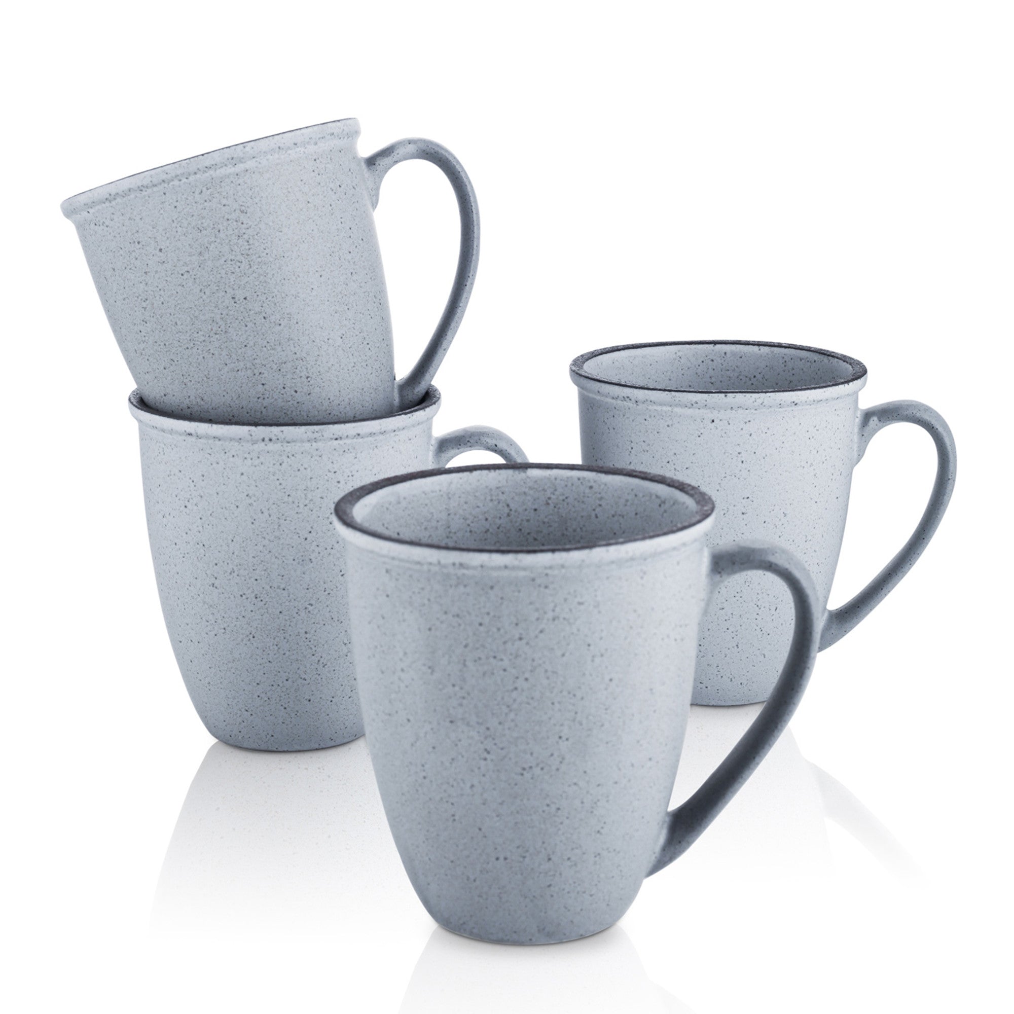 Introducing a single stoneware mug that combines style and functionality. The mug features a soft, muted light blue – gray base color with dark gray/black speckles, creating a rustic yet contemporary look. Its tapered shape and ergonomic handle make it comfortable to hold, while the matte finish adds a touch of sophistication.