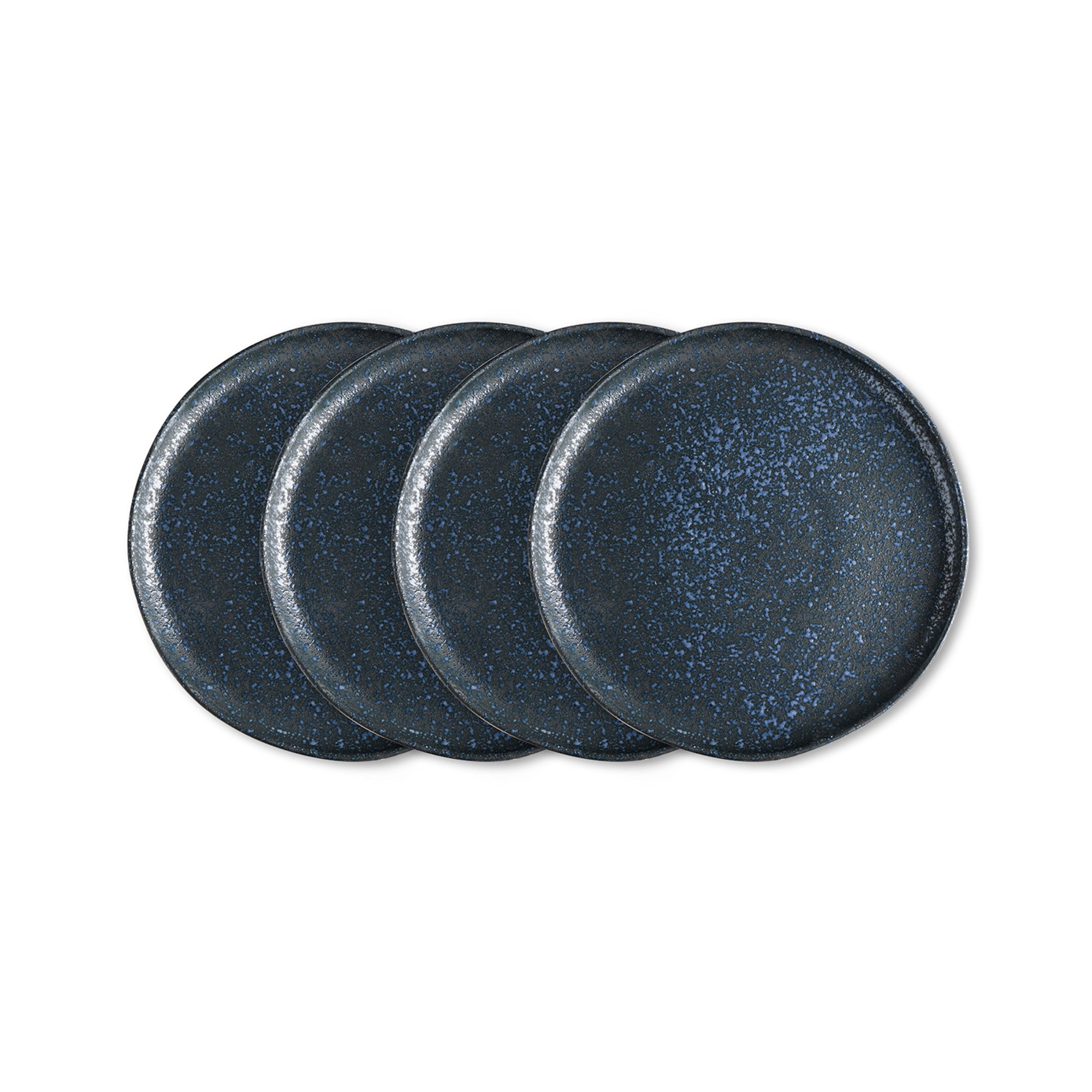 Discover this stunning dinnerware set featuring dark blue stoneware pieces with white speckles. The set includes a dinner plate, a salad/serving bowl, and a partial plate, all with a matte semi – gloss solid glaze. The classic round, rimmed design with a contemporary coupe – style edge adds a touch of modern sophistication to your dining table.