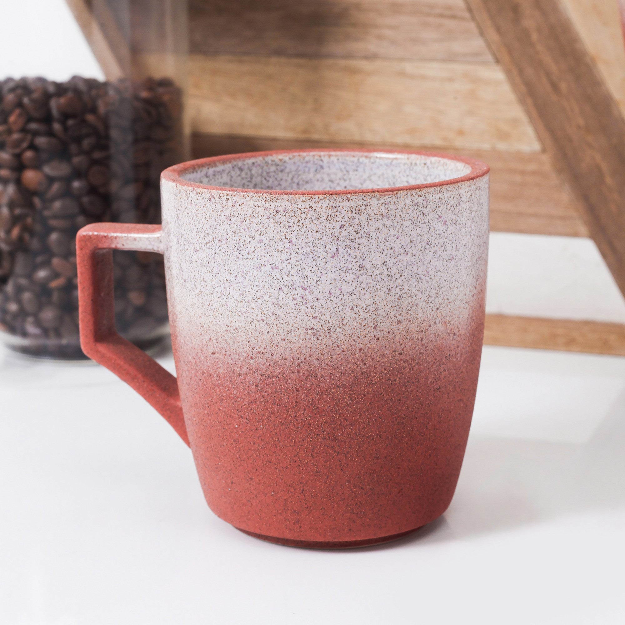- Design: A classic mug shape with straight vertical sides, a simple angular handle, and a wide, smooth rim. The exterior features a solid color gradient from reddish-brown to white, while the interior rim has a speckled design.