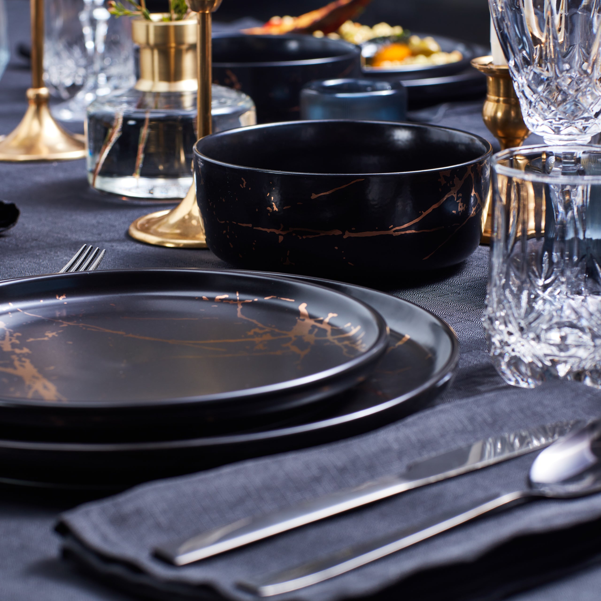 - Design: The color scheme consists of a primary matte black base with metallic gold marbling accents. The plates are round and rimmed, with a smooth, even rim.