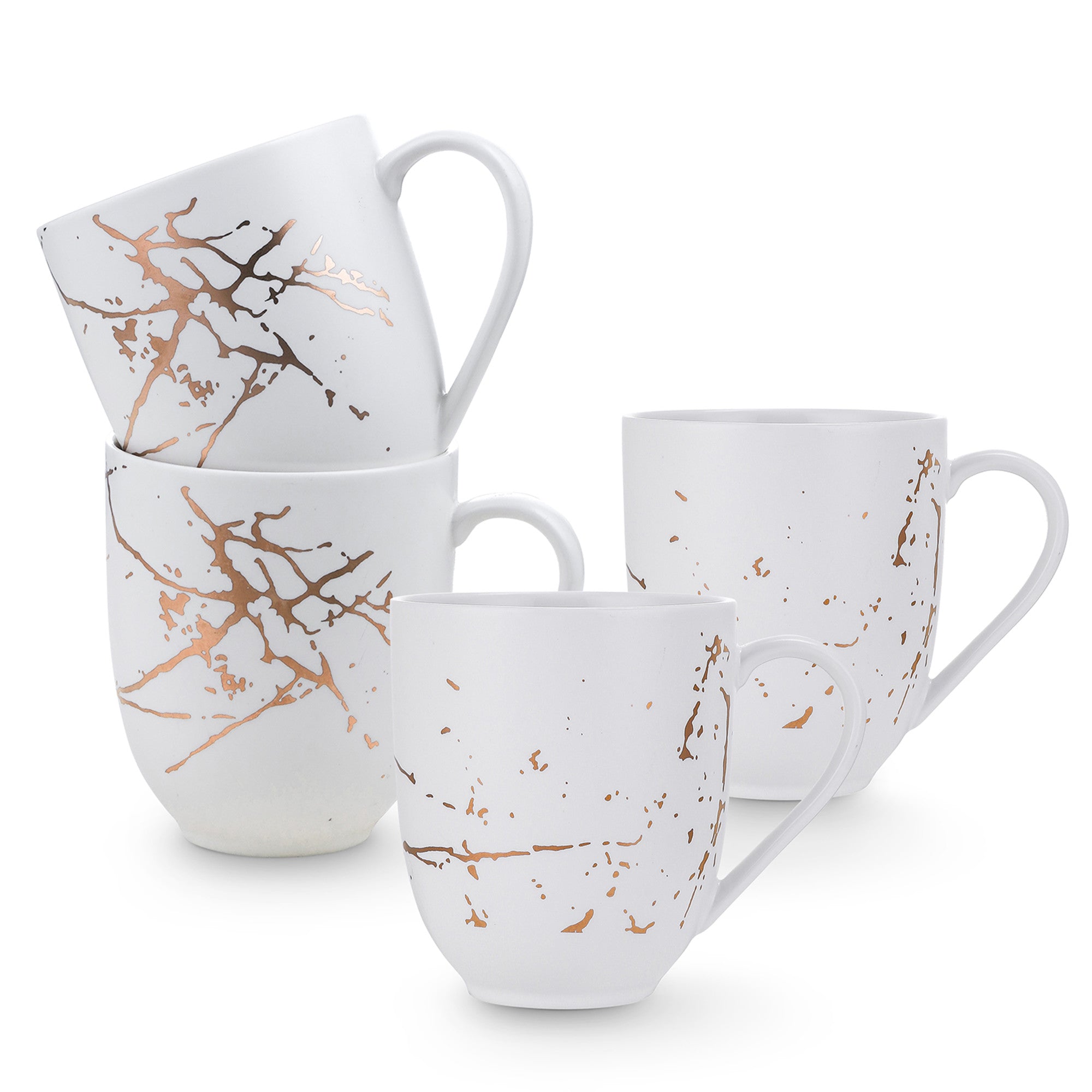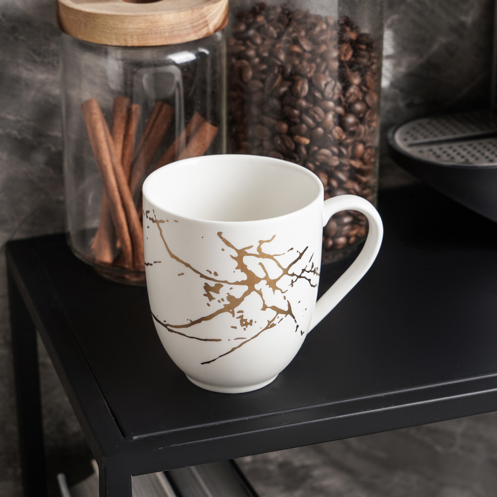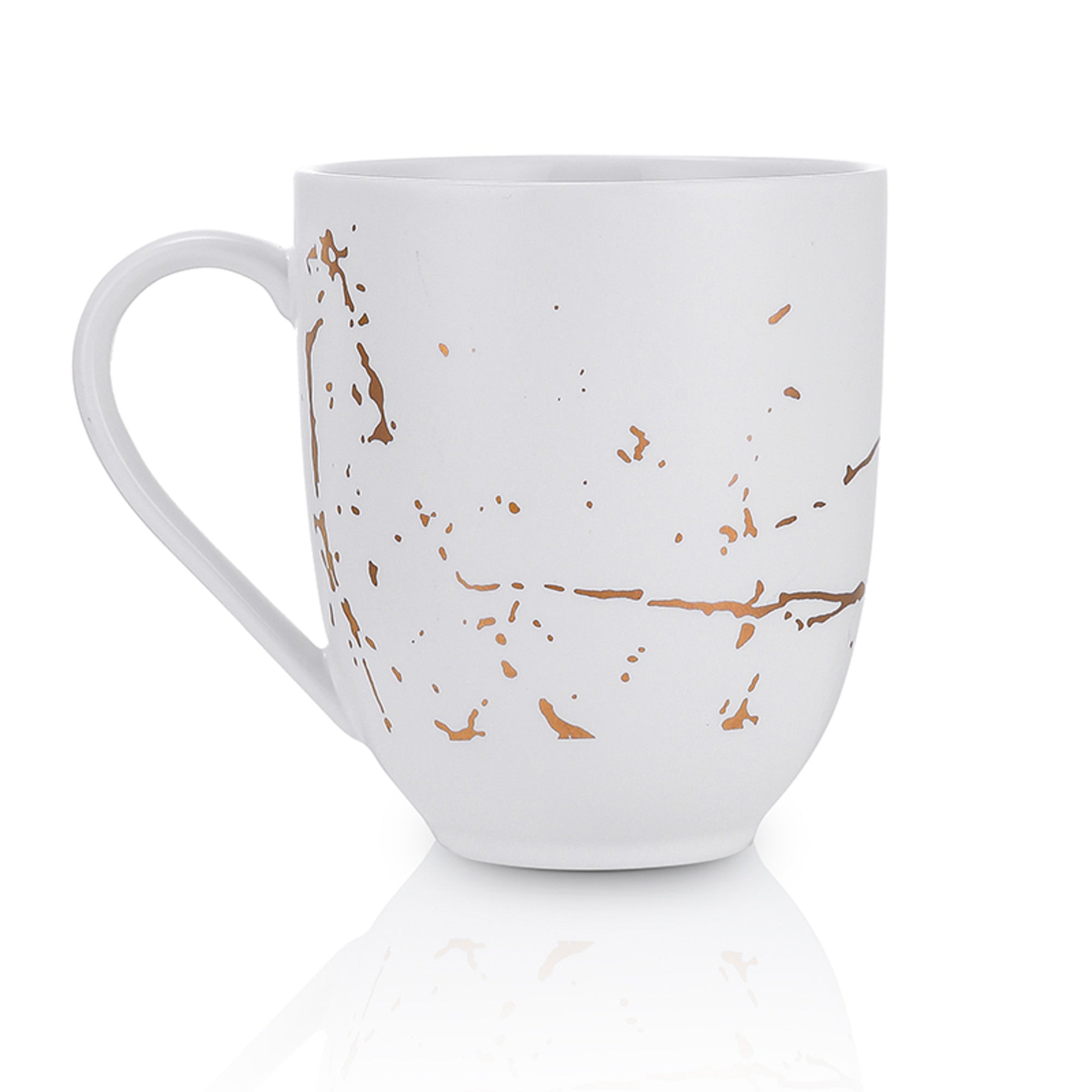 - Design: White base with a metallic gold splatter pattern, rounded cylindrical body, curved handle, and a simple straight rim.